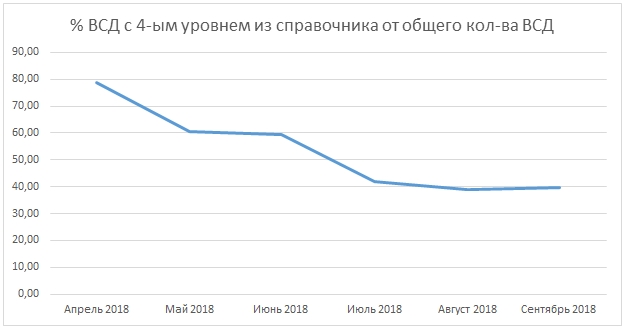 Как видно из данных Рис. 3., в июле-сентябре достигнута стабилизация доли эВСД, оформляемых с использованием 4-го уровня справочника Меркурия, причем динамика изменения этого показателя является не положительной, а отрицательной.