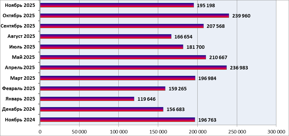 На Рис. 2 показана общая динамика внесения данных о пробах за последние 13 месяцев, начиная с ноября 2024 года.