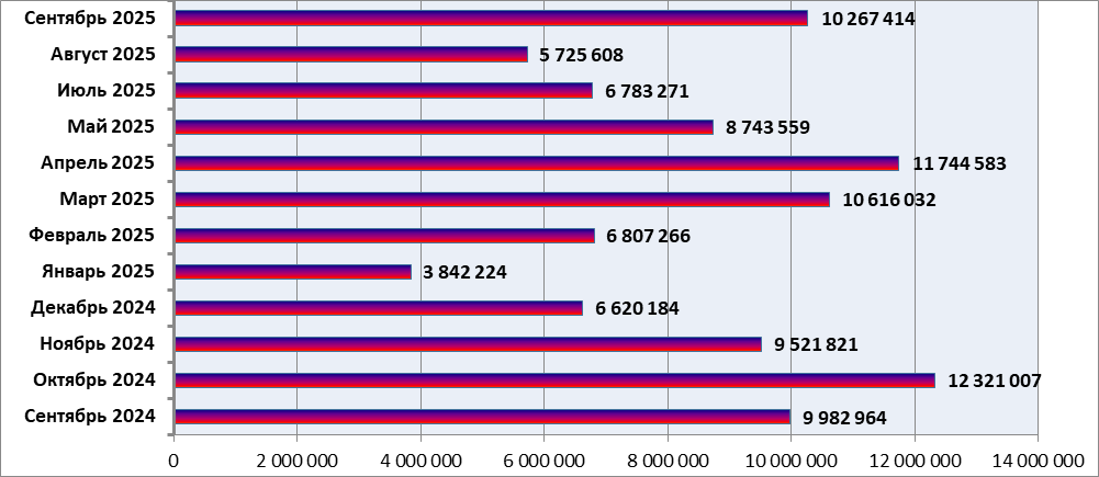 На Рис. 2 показана общая динамика внесения данных о пробах за последние 13 месяцев, начиная с сентября 2024 года.