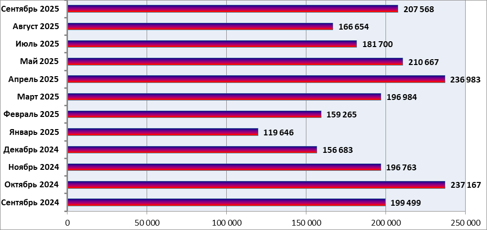 На Рис. 1 показана общая динамика внесения данных об исследованиях за последние 13 месяцев, начиная с сентября 2025 года.