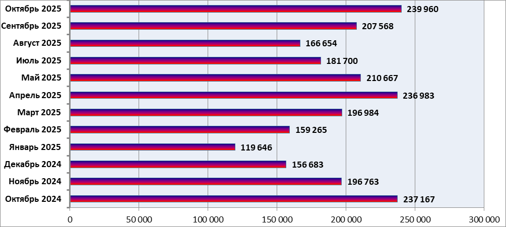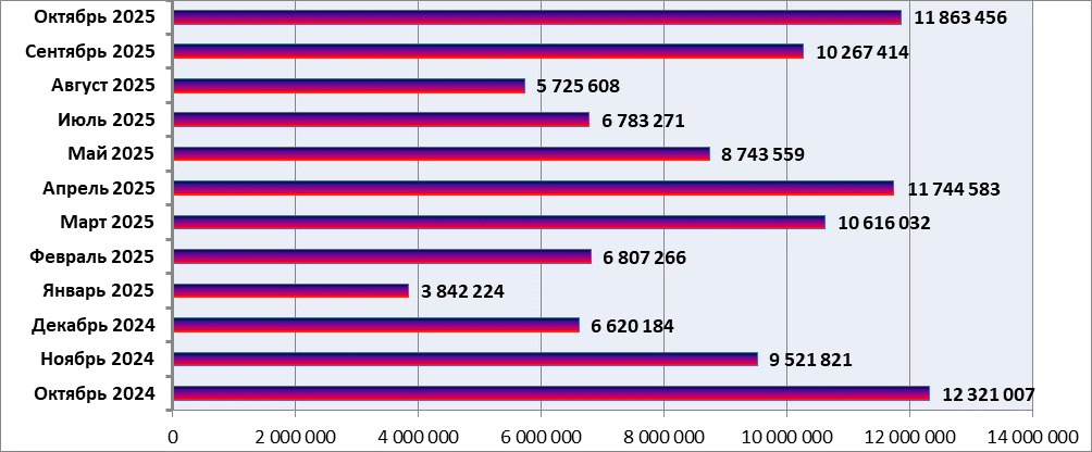На Рис. 2 показана общая динамика внесения данных о пробах за последние 13 месяцев, начиная с октября 2024 года.