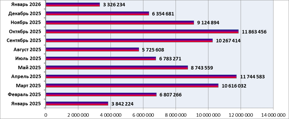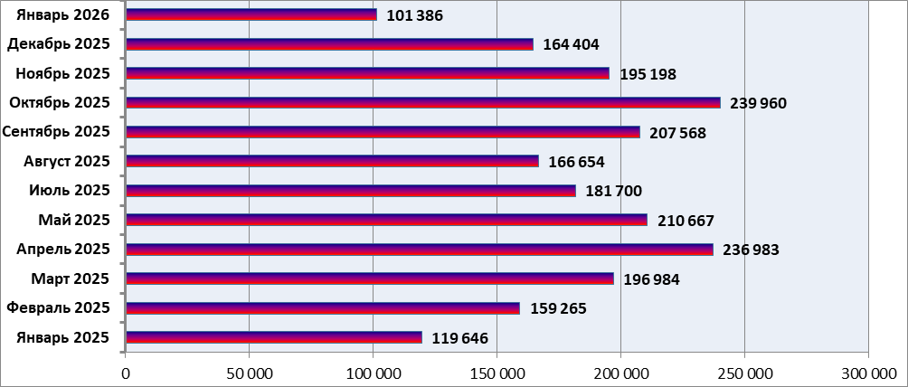 На Рис. 2 показана общая динамика внесения данных о пробах за последние 13 месяцев, начиная с января 2025 года.