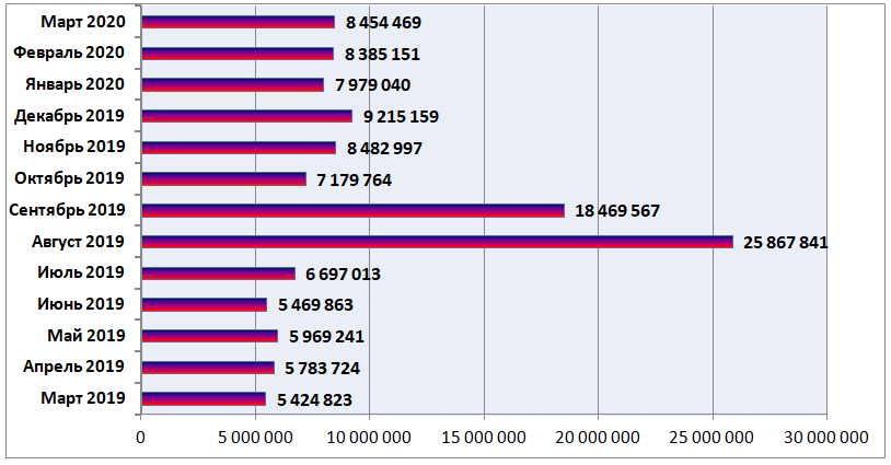 В марте 2020 года количество оформленных эВСД увеличилось на 7,78% по сравнению с февралем 2020 г. В пересчете на календарный год, эта величина соответствует оформлению более чем 4,1 миллиарда эВСД за год. Если сравнивать количество оформленных электронных сертификатов в марте 2020 года с аналогичным периодом в прошлом году, то количество оформляемых эВСД увеличилось в 2,40 раза. Количество эВСД, оформляемых за час, в период наибольшей нагрузки, составляло 784’746 (в прошлом месяце 789’487). Количество эВСД, оформляемых ежедневно, достигало максимального значения 12’789’008 эВСД (в прошлом месяце 12’511’279).