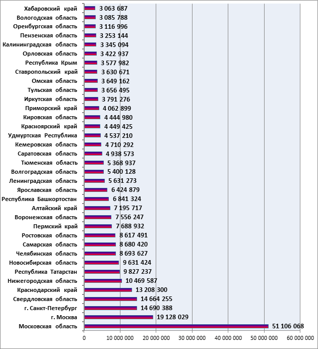 Рис. 12. Субъекты Российской Федерации в которых проходило аттестацию более 20 специалистов. По горизонтальной оси – количество специалистов, проходивших аттестацию.