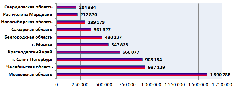 Рис. 21. Субъекты Российской Федерации, входящие в группу лидеров по количеству задействованных в электронной сертификации хозяйствующих субъектов-отправителей продукции. По горизонтальной оси – количество хозяйствующих субъектов-отправителей за месяц.