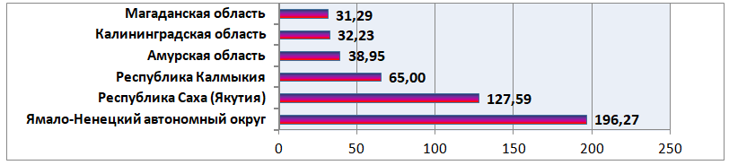 Группу аутсайдеров по данному показателю составляют 6 субъектов Российской Федерации, в адрес которых (включая сам субъект) оформлено менее 0,4 эВСД на душу населения этих субъектов (список ранжирован по алфавиту): Кабардино-Балкарская Республика, Республика Дагестан, Республика Ингушетия, Республика Тыва, Чеченская Республика, Чукотский автономный округ.